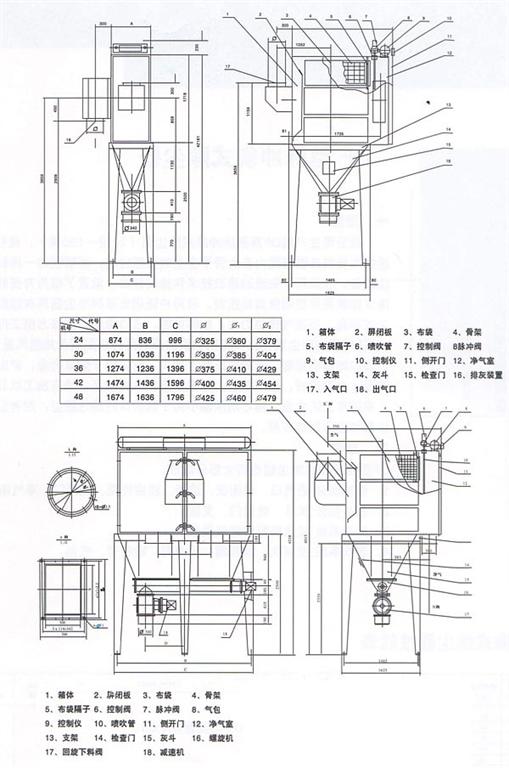 1.箱體部分:進(jìn)氣口、屏蔽板、濾袋、濾袋框架、側(cè)開門、凈氣箱、出氣口